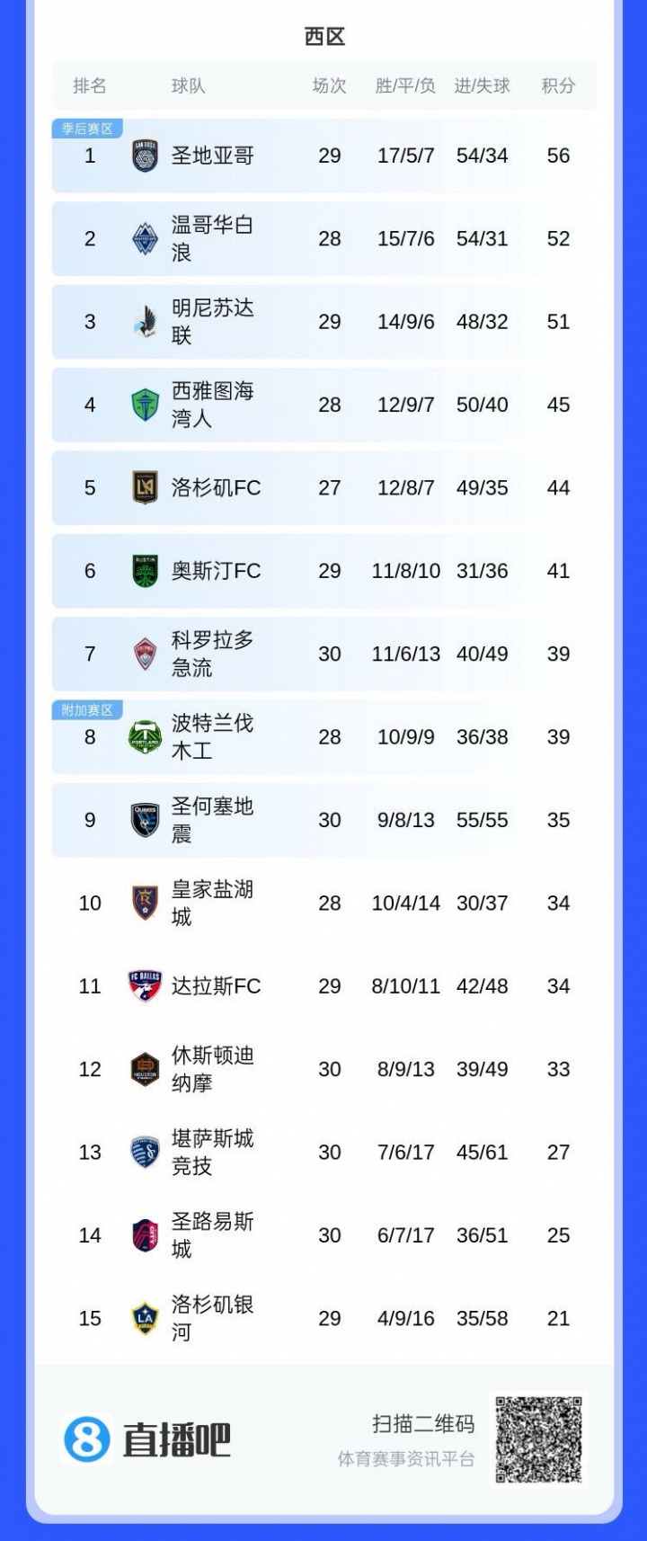 美职联积分榜,迈阿密国际少赛跌至东部第8,暂未进入季后赛区。