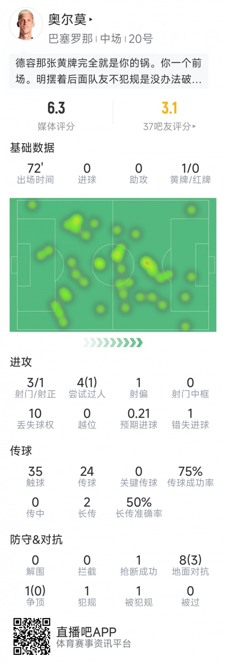 足球新闻c罗 10月2日讯 在本轮欧冠巴萨对阵巴黎的赛事 中,奥尔莫杆位出场,以下为他在本场数据: 赛事 时间72分钟 3射1正 1次失良机 35次触球 传送球 成功率75% 1次抄截 9次对峙 3次成功 评分6.3分足球新闻c罗...