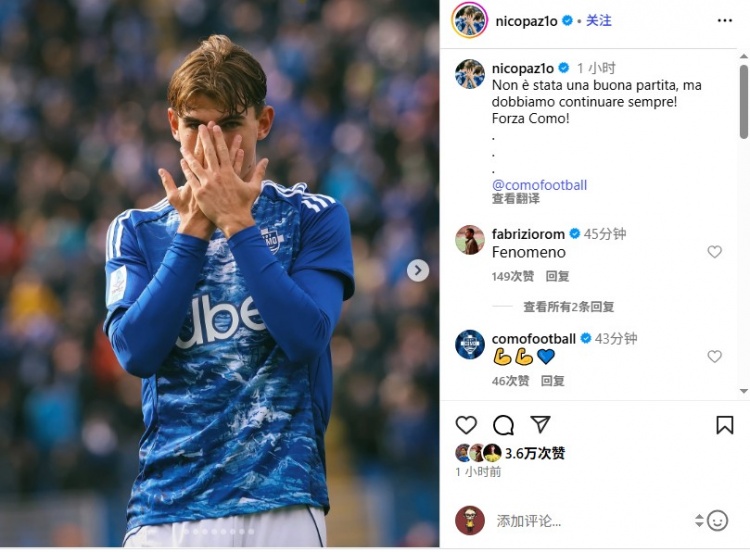 在哪看足球直播免费 9月28日讯 科莫中场球员尼科-帕斯在社交媒体发文,鼓励球队。 科莫本轮1-1战平克雷莫内塞在哪看足...