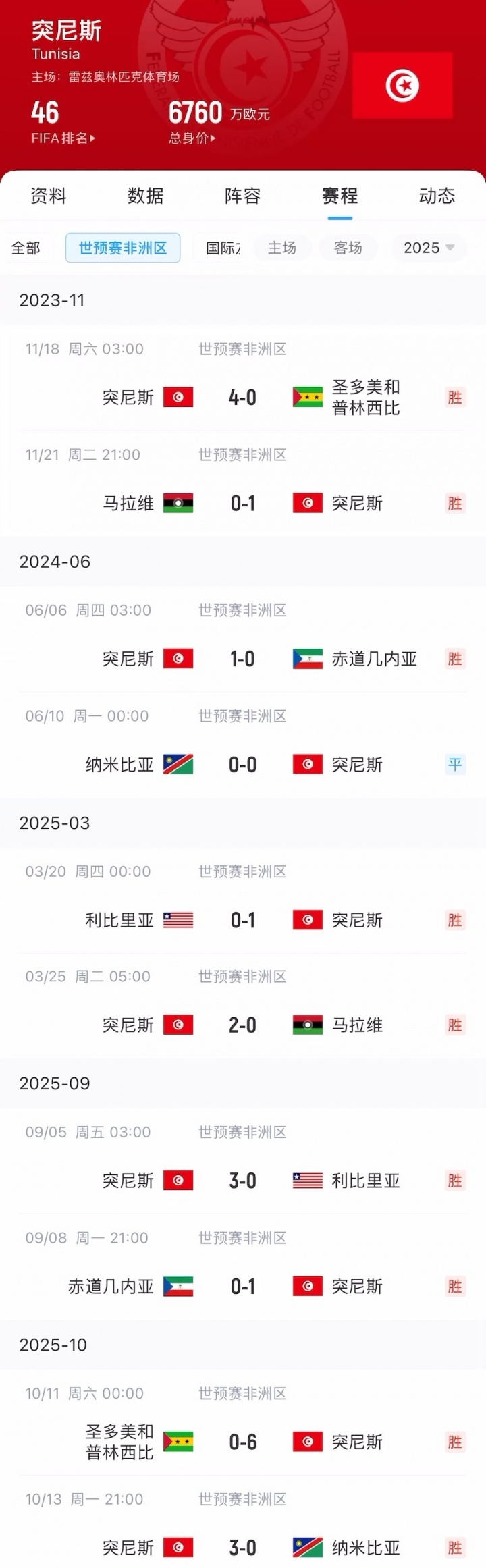 在本阶段世预赛中,欧洲杯直播吧突尼斯除了客战纳米比亚时0-0战平,其他场次全部取胜且一球未失。