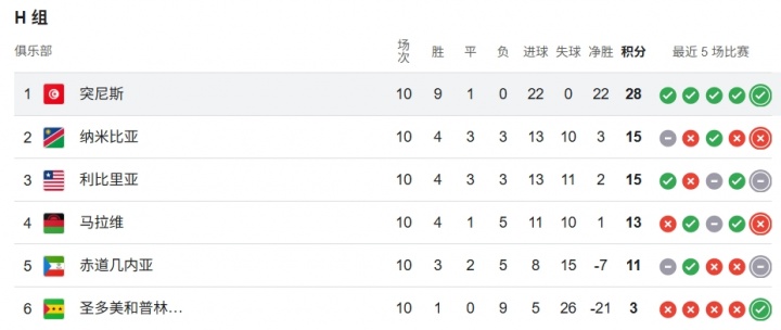 10月13日讯 世预赛非洲区小组赛H组今天结束了最后一轮的全部较量,最终突尼斯以10轮28分,进22球失0球的无解战绩小组第一收官。