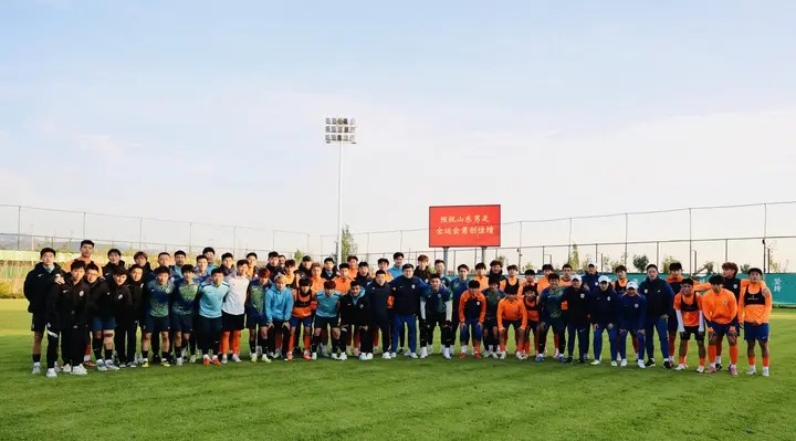 赛前热身 赛结束后,泰安天贶与山东泰山B队球员合影留念,现场大屏幕打出标语,预祝山东U20男足在全运会取得好成绩。