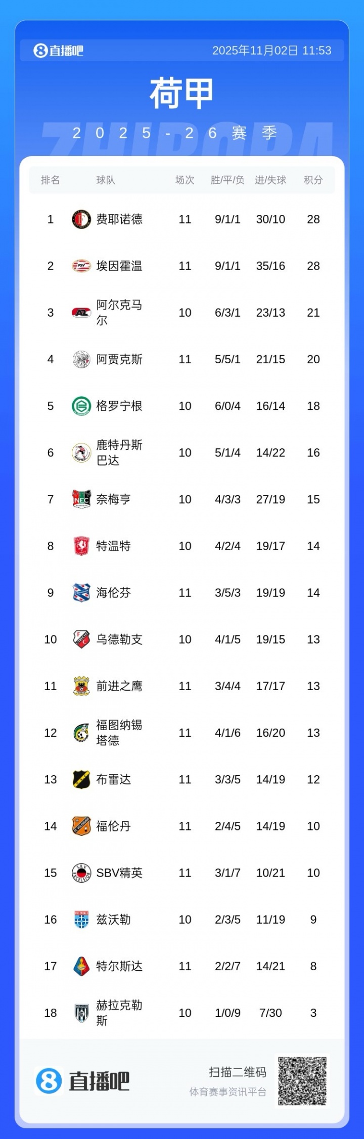 荷甲11轮过后,主指导教练员范佩西带领费耶诺德9胜1平1负,进30球丢10球,积28分排在荷甲第一。