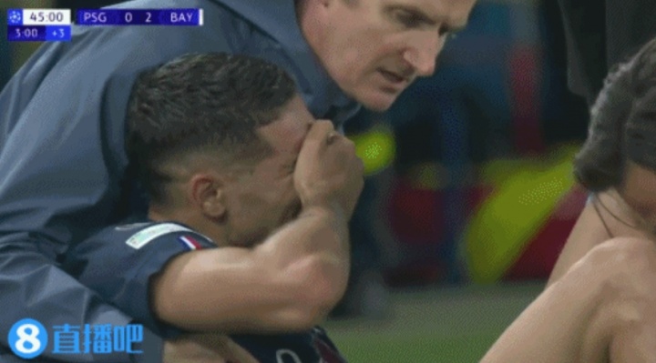 11月05日讯 欧冠巴黎vs拜仁上半场结束前,阿什拉夫遭迪亚斯剪刀脚铲翻后坐地痛哭,足球直播无插件免费在线观看直接伤退离场。