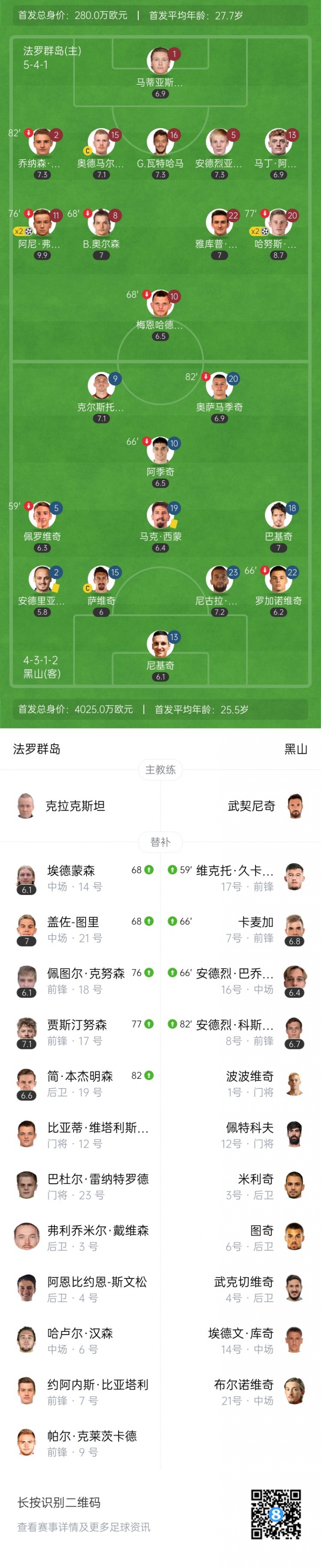 对比两队的阵形 ,免费欧洲杯直播法罗群岛的杆位11人身价仅280万,大部分球员都在本土职业联赛 效力;而黑山锋线坐拥两位在意甲效力的球员,亚特兰大的克尔斯托维奇和尤文的阿季奇,杆位11人身价4025万欧。