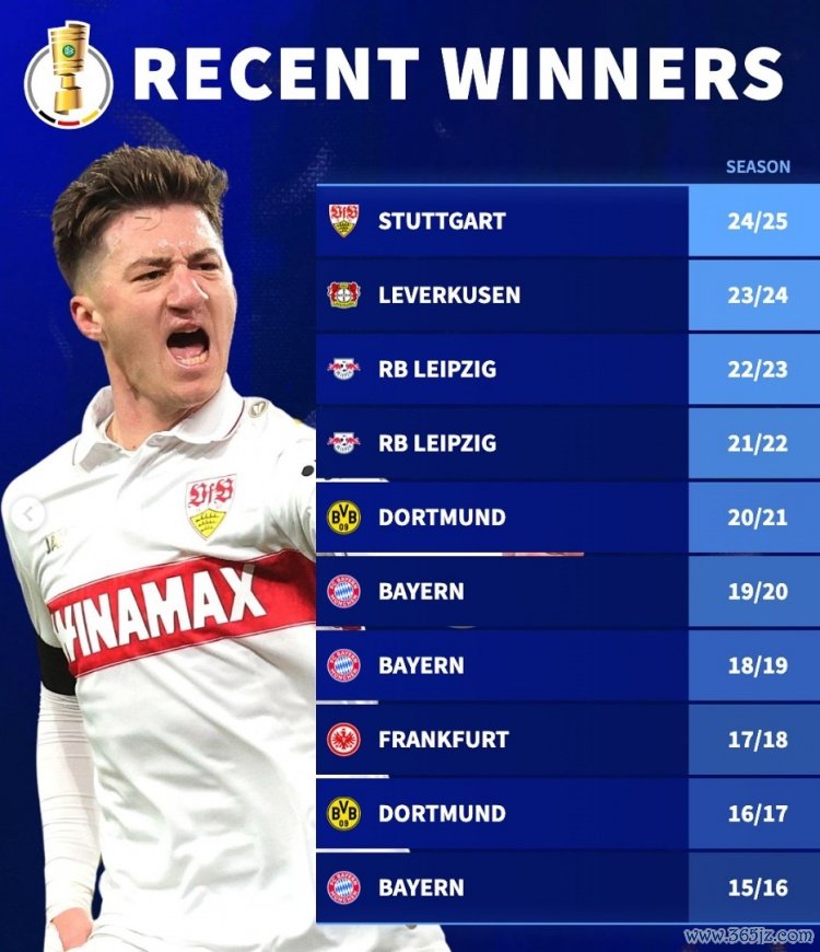 10月29日讯 《转会市场》统计了近10年德国杯第一名 ,拜仁3次居首但已5年未能夺魁 ,多特、莱比锡各2冠。